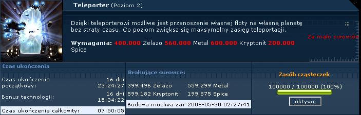 Użycie teleportu![]() Dwóch do teleportacji, Scotty!No to o co chodzi? Ludzie wypruwają sobie żyły by rozwinąć napędy do poziomu 22, a tu można się od tak po prostu teleportować z punktu A do B? Cuż... nie do końca. Są tu pewne haczyki, dotyczące "po prostu", jak i "A" i "B"... więc tym razem od początku... Czym jest teleportacja?Wymaganymi budynkami, badaniami oraz energią, by teleportować siły z lub bez ładunku z jednej kolonii na inną. Przy tym dzieje się to bez zużycia spice i w najkrótszym możliwym czasie. Po co mi teleportacja?Na obu planetach, i początkowej i docelowej potrzebny jest teleport. By się teleportować do swojej galaktyki, lub do galaktyki obok potrzebny jest teleport na poziomie 1 w obu miejscach. By wysłać jednostki gdzieś dalej, trzeba podnieść poziom teleportu, ale też zużywa on wtedy więcej energii. Badania: Teleportacja Poziom 6 Budynki Laboratorium Badawcze Poziom 10 na jednej planecie, by rozwinąć technologię teleportacji Centrum Rozwojowe Poziom 12 na obu planetach Przyspieszacz Mikrowywtemowy Poziom 2 na obu planetach Teleport Poziom 1 na obu planetach Baza Floty Poziom 1 na planecie początkowej Dodatkowo ta sama ilość energii na obu planetach Jak działa teleport?Wchodzi się w zakładkę "Budynki" na planecie początkowej i zjeżdża na sam dół do teleportu. Jeśli jest już naładowany do odpowiedniego poziomu można nacisnąć "Aktywuj". Teleport na planecie docelowej również musi być naładowany, nie musi jednak zostać aktywowany. ![]() Po tym zmieniają się się automatycznie rozkazy , a z góry strony pojawia się napis: ![]() Portal jest otwarty przez maksymalnie 10 minut. Aby wysłać flotę na planetę docelową używając dodatkowego rozkazu "Teleportacja" na tamtej planecie jest naładowany teleport. Po przeleceniu floty przez teleport portal się automatycznie zamyka a flota natychmiast pojawia się po drugiej stronie. Zużyta energia jest odejmowana od zasobów teleportu na obu planetach. Strategia |